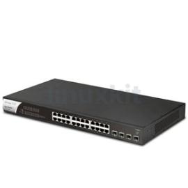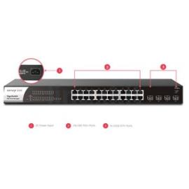 The DrayTek VSP1281X-K is a smart Gigabit network switch, featuring 24 x GbE RJ45 ports, 4 x SFP+ uplinks for throughput of up to 10Gbps, and 140W PoE budget for powering VoIP phones, access points and surveillance cameras. In addition to its physical specs, the VSP1281X is compatible with ONVIF IP surveillance management, making it an ideal choice to support an IP surveillance network, supports automatic VLAN assignment for applications like phones and cameras, and can be fully remotely managed through VigorACS.