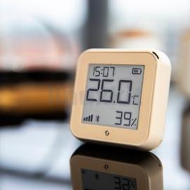The Shelly H&T Gen 3 Temperature and Humidity Sensor in mocha can accurately track the temperature and humidity of the surrounding environment, and can relay information to other Shelly devices for complete intelligently-implemented climate control. The Shelly H&T includes a low energy consumption e-paper display and built-in clock, and is wall-mountable for extra flexibility.