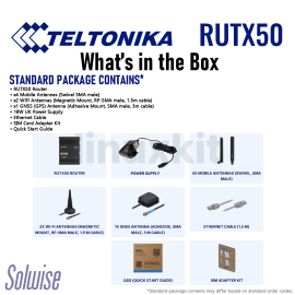 • What's in the Box: • RUTX50 Router • 18W UK Power Supply • x4 Mobile Antennas (Swivel, SMA male) • x2 WiFi Antennas (Magnetic mount, RP-SMA male, 1.5m cable) • x1 GNSS (GPS) Antenna (Adhesive mount, SMA male, 3m cable) • x1 Ethernet Cable • SIM card size adapter kit • Quick Start Guide