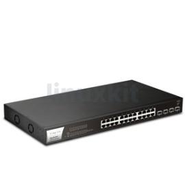 The DrayTek VSP1281X-K is a smart Gigabit network switch, featuring 24 x GbE RJ45 ports, 4 x SFP+ uplinks for throughput of up to 10Gbps, and 140W PoE budget for powering VoIP phones, access points and surveillance cameras. In addition to its physical specs, the VSP1281X is compatible with ONVIF IP surveillance management, making it an ideal choice to support an IP surveillance network, supports automatic VLAN assignment for applications like phones and cameras, and can be fully remotely managed through VigorACS.