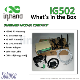 - What's in the Box: • IG502 5G Gateway • x2 5G Antennas • x1 WiFi Antenna • x1 GPS Antenna • Power Adapter • Ethernet Cable • DIN-rail (integrated)