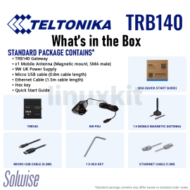 - What's in the box: • TRB140 Gateway • 9W UK Power Supply • x1 Mobile antenna (Magnetic mount, SMA male, 3m cable length) • Micro USB cable (0.8m cable length) • Ethernet cable (1.5m cable length) • Hex key • Quick Start Guide