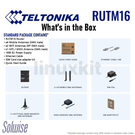 - What's in the box: • RUTM16 Router • x2 Mobile Antennas (Swivel, SMA male) • x2 WiFi Antennas (Magnetic mount, RP-SMA male) • x1 GPS / GNSS Antenna (Adhesive mount, RP-SMA male) • 18W EU Power Supply • Ethernet cable • SIM Card size adapter kit • Quick Start Guide