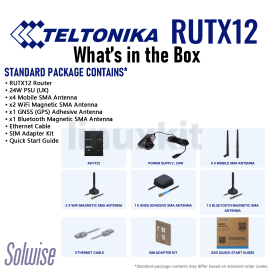 • What's in the box: • RUTX12 Router • 24W PSU (UK) • x4 Mobile Antennas (swivel, SMA male) • x2 WiFi Antennas (magnetic mount, RP-SMA male) • x1 GNSS (GPS) Antenna (adhesive, SMA male) • x1 Bluetooth Antenna (magnetic mount, RP-SMA male) • Ethernet cable • SIM Adapter kit • QSG (Quick Start Guide)