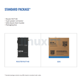 - What's in the box: • Router RUT140 • 3-pin power connector (No Power Supply Included) • QSG (Quick Start Guide) • Packaging box