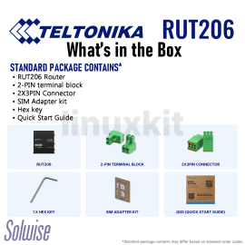 - What's in the box: • RUT206 Router • 2-PIN terminal block • 2X3PIN Connector • SIM Adapter kit • Hex key • QSG (Quick Start Guide)