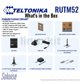 - What's in the box: • RUTM52 Router • x8 Mobile antennas (magnetic mount, SMA male) • x2 WiFi antennas (magnetic mount, RP-SMA male) • x1 GNSS / GPS antenna (adhesive mount, SMA male) • 18W UK Power Supply • Ethernet cable • SIM Card size adapter kit • Quick Start Guide