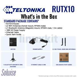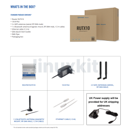 - What's in the box: • RUTX10 Router • x2 WiFi Antennas (Swivel RP-SMA male) • x1 Bluetooth Antenna (Magnetic mount RP-SMA male, 1.5m cable) • 18W UK Power Supply • Ethernet Cable • Quick Start Guide