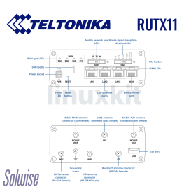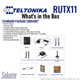 - What's in the Box: • RUTX11 Router • 18W PSU (UK) • x2 Mobile Antennas (swivel, SMA male) • x2 WiFi Antennas (swivel, RP-SMA male) • x1 GNSS (GPS) Antenna (adhesive, SMA male, 3m cable) • x1 Bluetooth Antenna (magnetic mount, RP-SMA male, 1.5m cable) • Ethernet cable (1.5m) • SIM Adapter kit • QSG (Quick Start Guide)