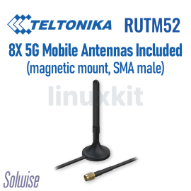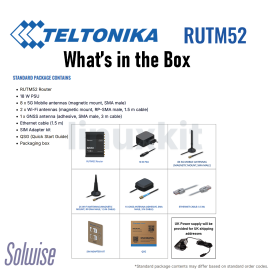 • Package Contents: • RUTM52 Router • 18 W PSU • 8 x 5G Mobile antennas (magnetic mount, SMA male) • 2 x WiFi antennas (magnetic mount, RP-SMA male, 1.5 m cable) • 1 x GNSS (GPS) antenna (adhesive, SMA male, 3 m cable) • Ethernet cable (1.5 m) • SIM Adapter kit • Quick Start Guide
