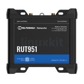 RUT951 Teltonika Dual-SIM 4G M2M Cat4 LTE router 4G/LTE up to 150 Mbps Download and 50 Mbps Upload 4G/LTE (Cat 4), 3G, 2G 2.4 GHz (b/g/n) WiFi4 Antennas & Connectors: x2 SMA for 4G/LTE, x2 RP-SMA for WiFi Dual SIM: With auto-failover, backup WAN and other switching scenarios 4x 10/100 Ethernet ports Manufactured in Europe Remote Management System available - click here for free demo Authorised Distributor » Price("4G-RUT951") Stock("4G-RUT951") 4G-RUT951 UK & Europe, the Middle East, Africa, Korea, Thailand, India Version - see specifications for frequencies covered