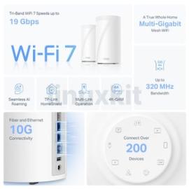 The TP-Link DECO BE85 is a WiFi 7 Mesh Router System. Experience a high-end Tri-Band Whole Home WiFi 7 with blazing-fast WiFi speeds up to 19 Gbps. The exclusive 6 GHz band provides exceptional bandwidth and congestion-free channels exclusive to all of your devices. This is a Pack of 2 x BE85 Routers.